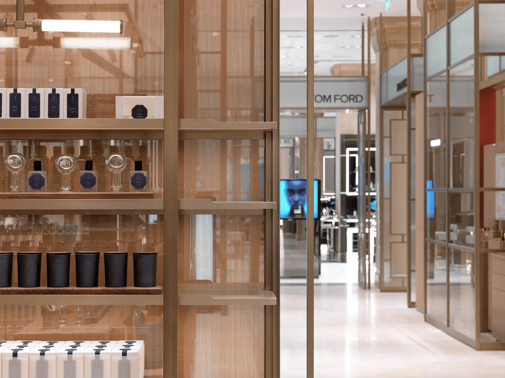 The layout was imagined as a series of rooms within a grand residence. GA Design retained the openness of the original retail floor yet introduced subtle partitions using satin nickel, cut glass and marble. These architectural cues create a sense of gentle division, giving each zone its own atmosphere while maintaining a cohesive flow.