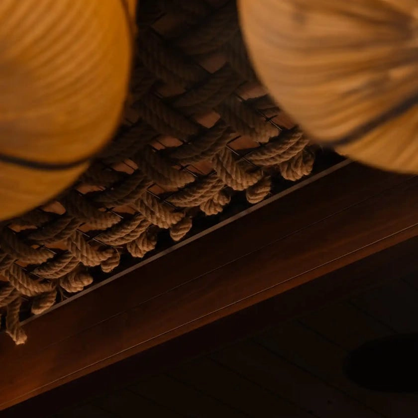 The interior is anchored by a long cocktail bar, an open kitchen and a garden terrace overlooking the Kuala Lumpur skyline. A vinyl DJ station inspired by Japanese listening bars brings movement and atmosphere, while the ceiling layers rope, reinterpreted lanterns and farming implements to create depth and texture. Kumiko fretwork screens provide a contemporary take on tradition, adding rhythm and visual richness. A bold mural inspired by Japanese dolls celebrates good fortune, shared moments and the joy of gathering.