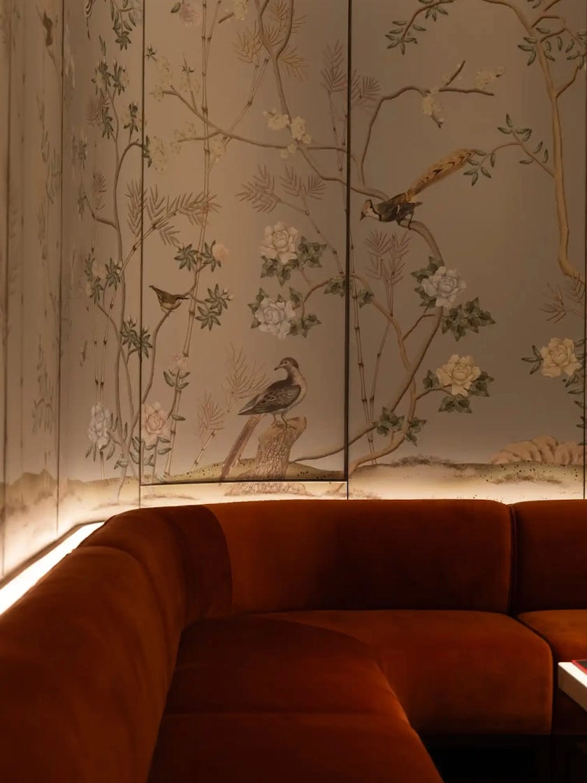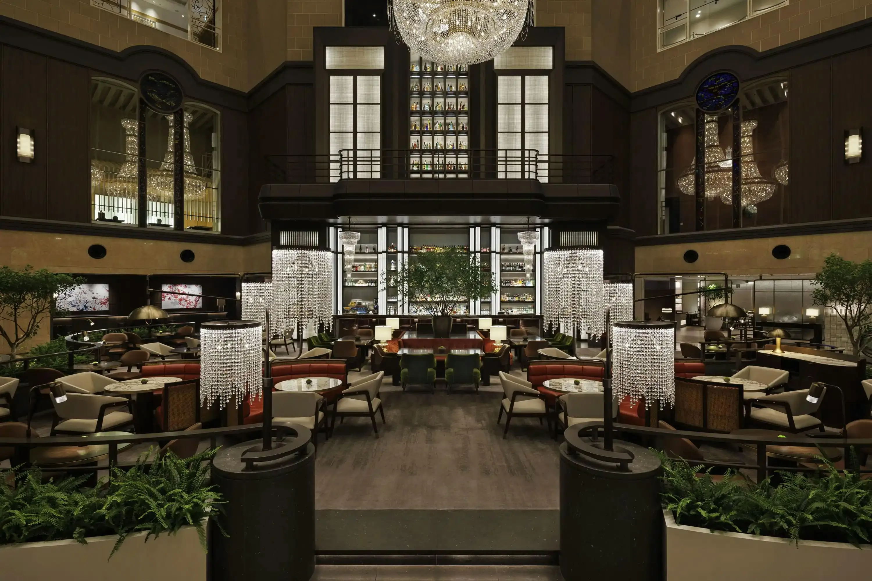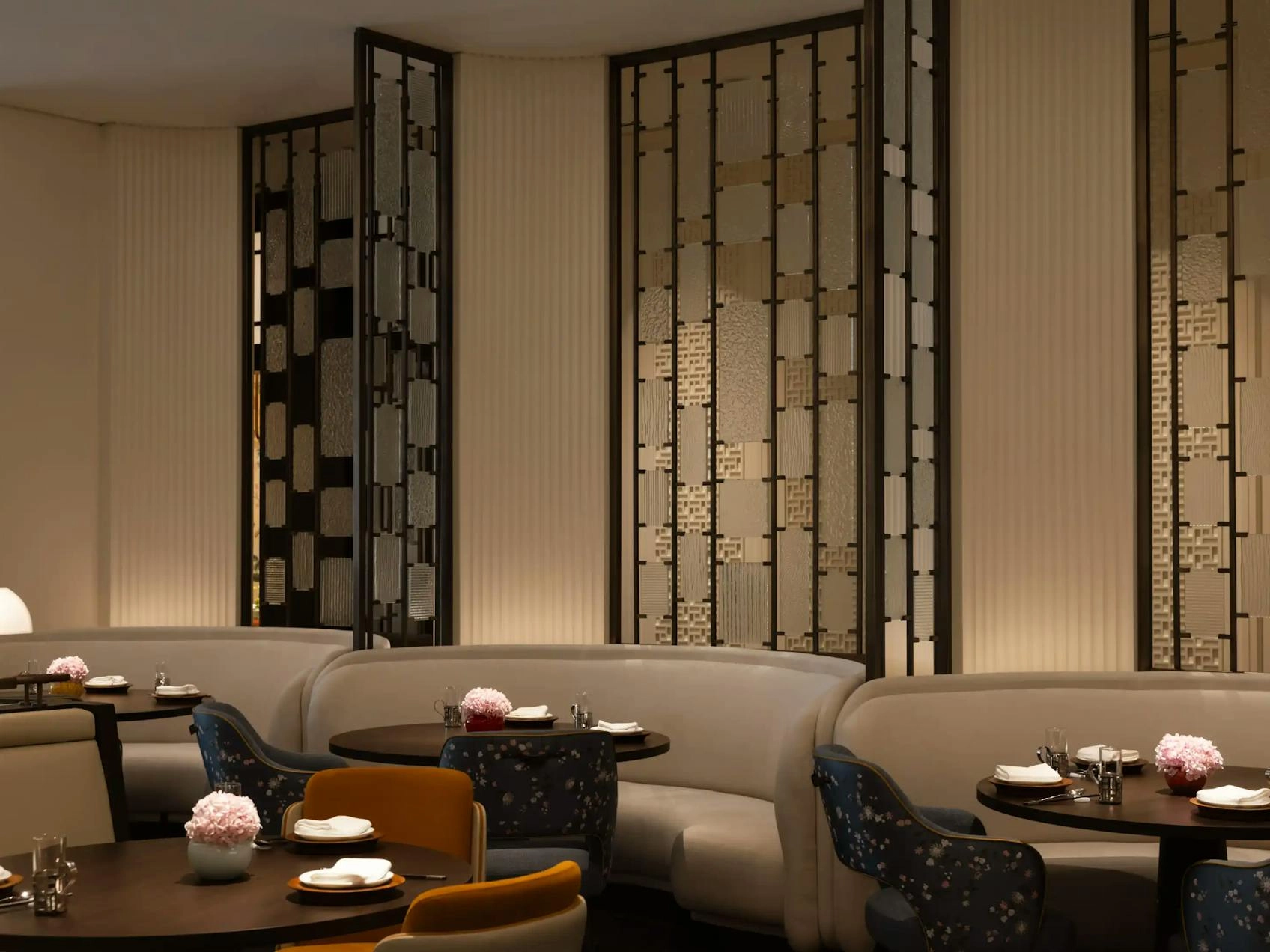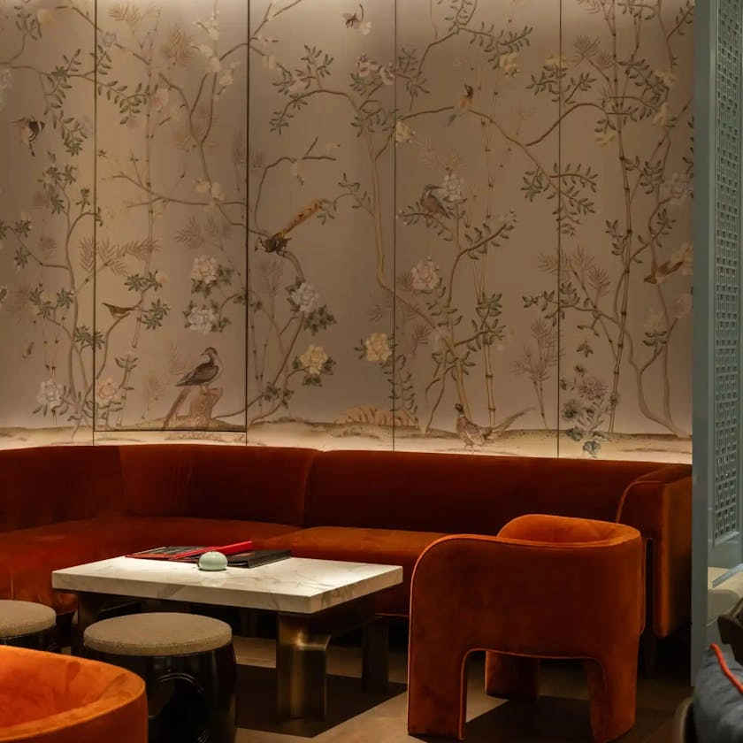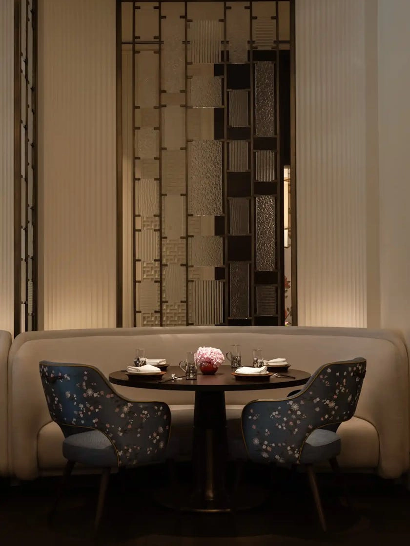 Private dining is central to the experience. Five private rooms offer flexibility and intimacy, each centred around a bespoke chandelier inspired by traditional lanterns and scaled for dramatic effect. These contemporary forms are set against ceilings detailed with traditional relief carvings, creating a dialogue between heritage and modernity that defines the atmosphere of each room.