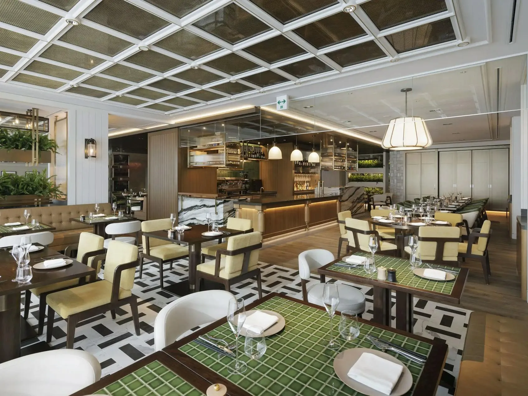 With the hotel facing a national park but limited access to natural light, GA introduced planting and greenery to bring the landscape indoors. This creates a visual connection to the all-day dining area beyond, which looks out towards the gardens. Original hand-crafted circular tiles from 1984 were carefully retained and celebrated, with their geometry echoed in furniture layouts, lighting and detailing to bridge past and present.