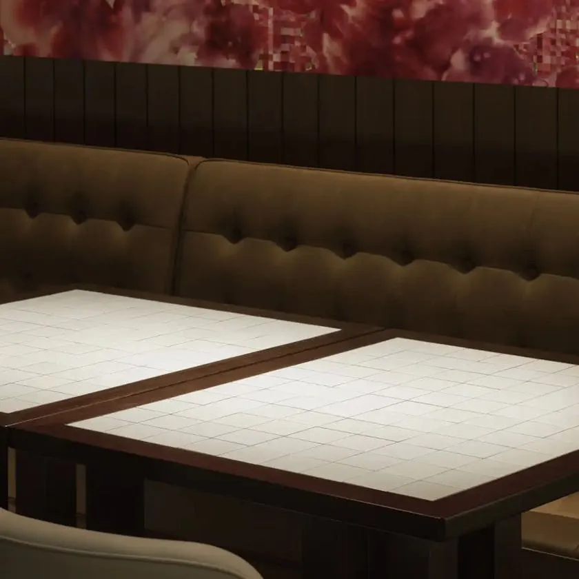 This contrast is expressed spatially rather than literally. Seating areas reflect the quieter side of the district, while a central open kitchen becomes a point of energy and movement, a place guests naturally pass through. A striped floor marks this transition, subtly referencing the rhythm of Tokyo’s pedestrian crossings and capturing the spirit of the city through architecture and flow.
