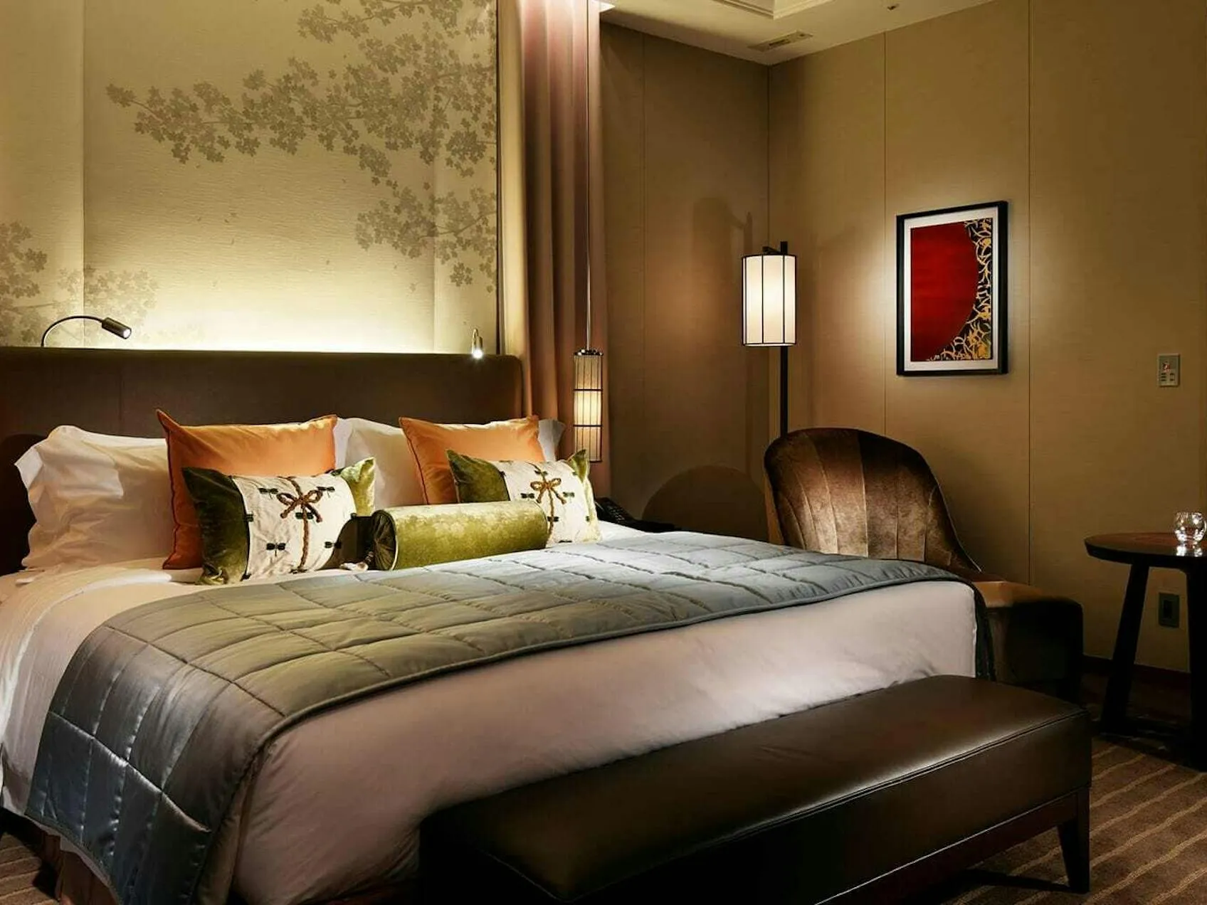 Guests arrive through an entrance hall of silver leaf, bronze and dark marble, anchored by a sculptural crystal tree. This softly lit moment gives way to brighter, sunlit spaces that reveal expansive views of the city and the hotel’s private Japanese garden.