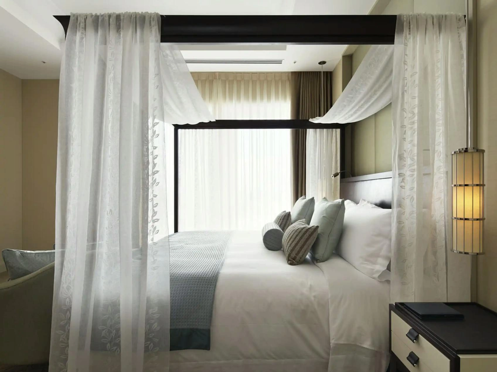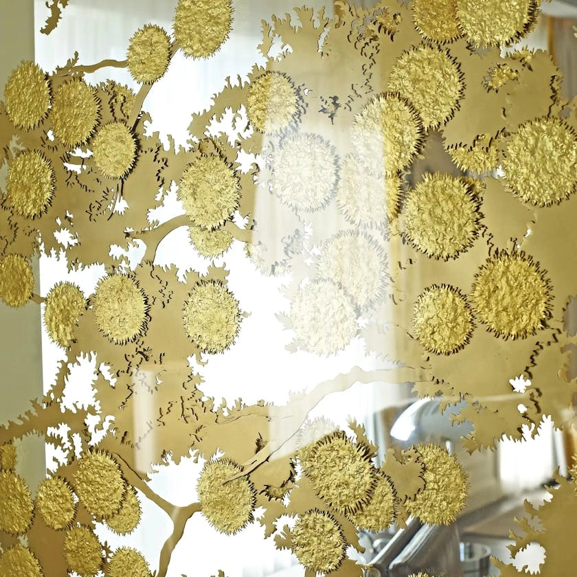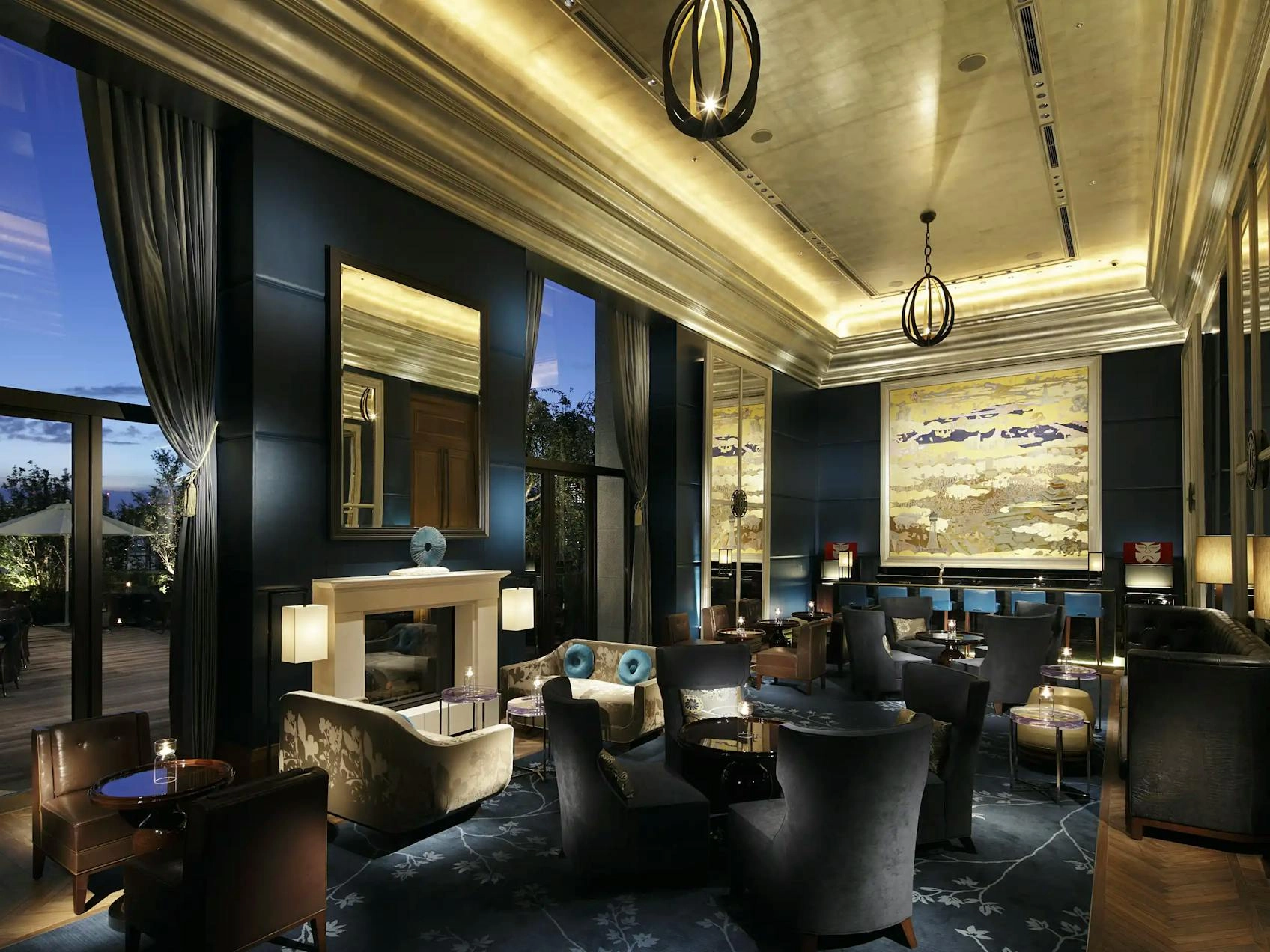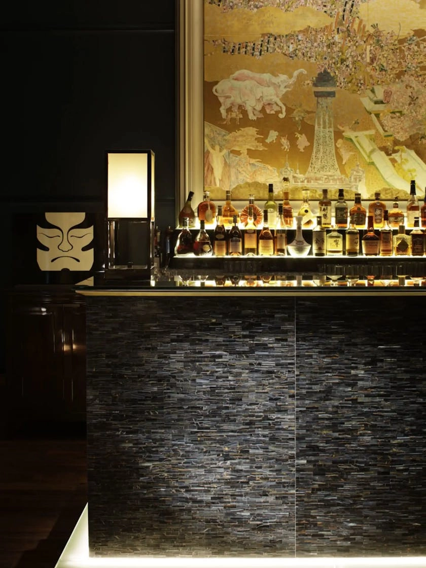 Guests arrive through an entrance hall of silver leaf, bronze and dark marble, anchored by a sculptural crystal tree. This softly lit moment gives way to brighter, sunlit spaces that reveal expansive views of the city and the hotel’s private Japanese garden.
