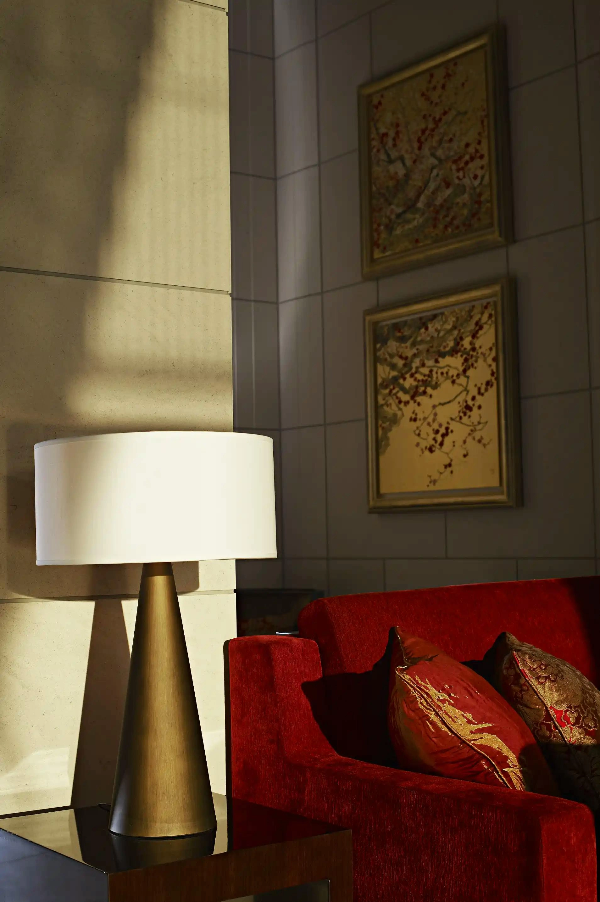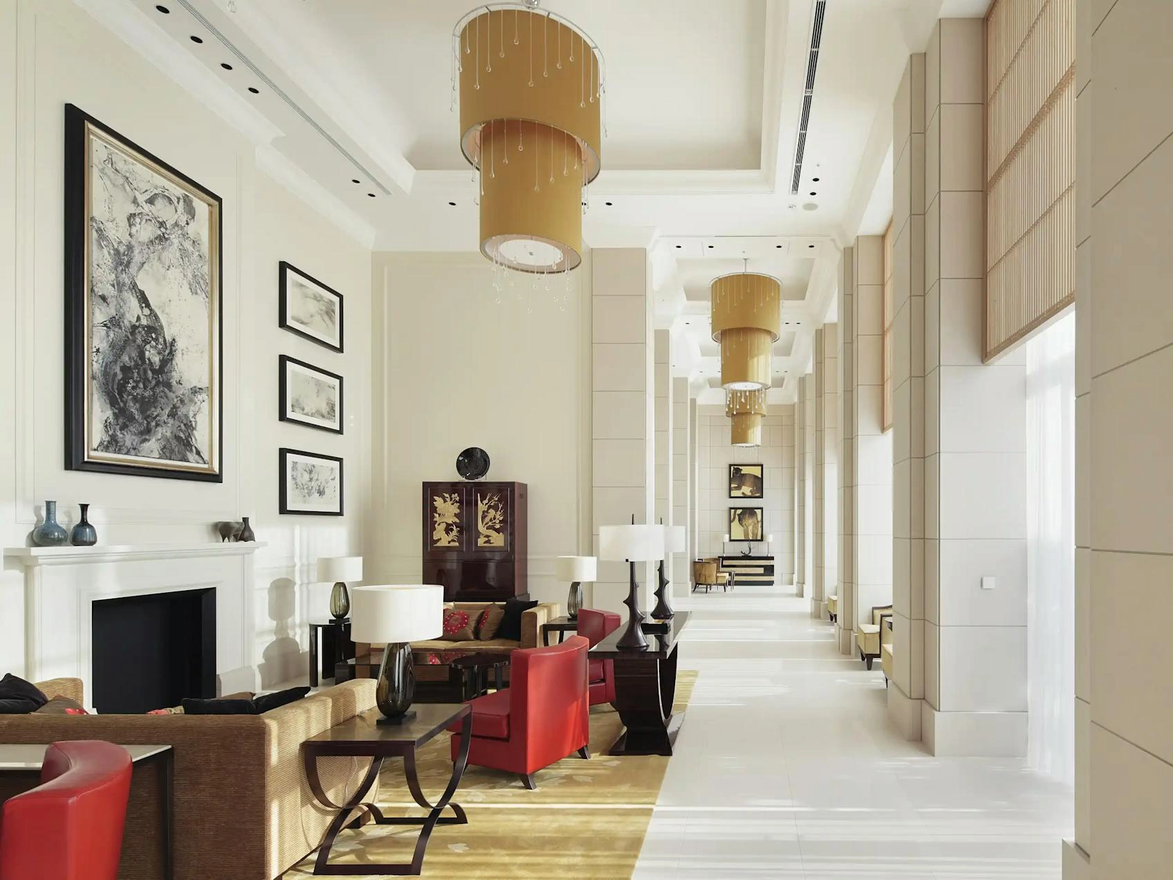 GA's design balances Japanese cultural references with Western architectural expression. Reception and lounge spaces reflect the warmth and clarity of the sun, with limestone floors and walls that recall historic Japanese construction. High coffered ceilings and bespoke chandeliers introduce grandeur, while framed views of nature bring stillness to the experience.